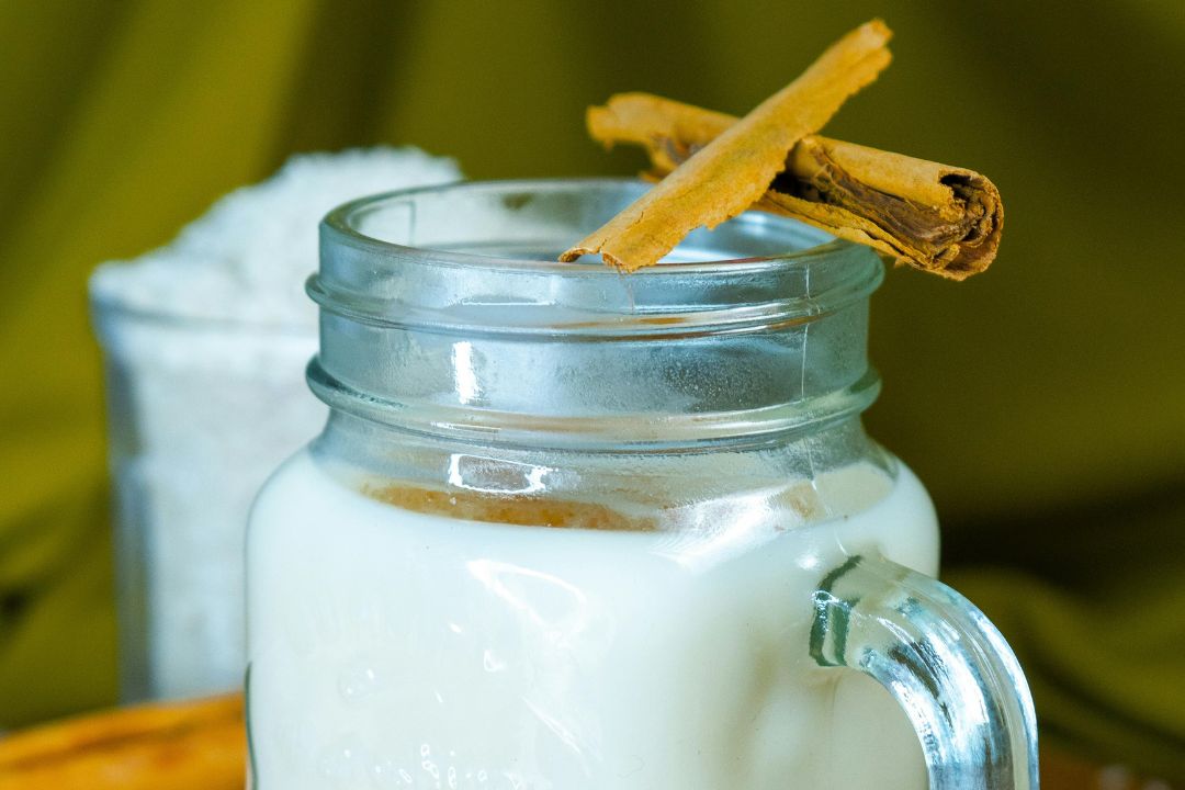 - Después de colar los sólidos, agregue la leche de almendras y el azúcar y revuelva para combinar. Puede verter sobre hielo para servir o simplemente en vasos. Puede espolvorear con canela molida si lo desea.